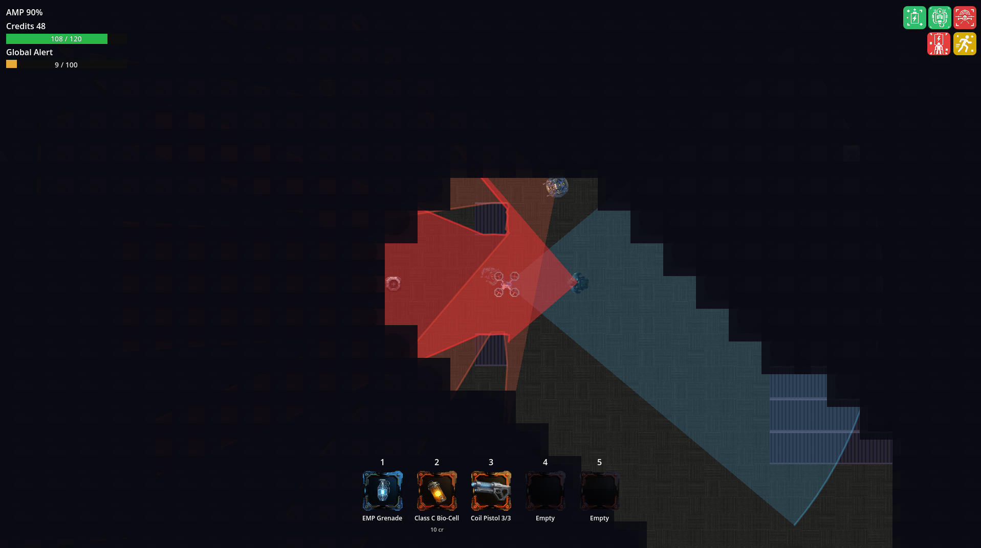 A top-down stealth extraction roguelite with an energy-based economy.
